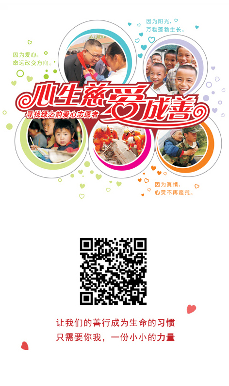 自2012年5月20日起,填寫“綠之韻愛心認捐書”參與“每天ー元錢”愛心捐贈(大于或等于365元),傳真至公司業(yè)務服務部,完成志愿者申請,即獲贈由公司統(tǒng)一制作的“綠之韻愛心志愿者T恤”及“愛心徽章”。