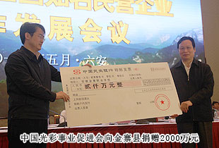 踐行光彩精神,助力老區(qū)發(fā)展。2013年5月9日上午,由中國光彩事業(yè)促進(jìn)會(huì)、中華全國工商業(yè)聯(lián)合會(huì)與安徽省人民政府聯(lián)合舉辦的“中國光彩事業(yè)六安行暨安徽省與全國知名民營企業(yè)合作發(fā)展會(huì)議”在安徽省六安市召開。本次大會(huì)旨在光大光彩事業(yè)、搭建合作平臺(tái),推進(jìn)大別山片區(qū)扶貧攻堅(jiān),深化安徽與全國知名民營企業(yè)合作。會(huì)上,中國光彩事業(yè)促進(jìn)會(huì)現(xiàn)場向金寨縣捐贈(zèng)2000萬元,全省各地市與多家企業(yè)現(xiàn)場集中簽約項(xiàng)目228個(gè),投資規(guī)模3485億元。