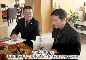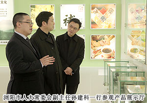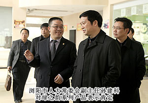 2013年1月25日上午,瀏陽市人大常委會副主任孫建科、瀏陽市人大常委會秘書長唐林軍一行蒞臨綠之韻集團考察指導工作,胡國安董事長全程陪同考察組參觀了綠之韻集團總部。