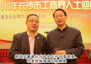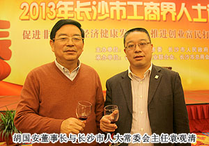 “話發(fā)展,謀未來,共迎新春佳節(jié)?!?013年1月23日,中共長沙市委、市政府舉行2013年長沙市工商界人士迎春酒會暨長沙市第四屆“優(yōu)秀中國特色社會主義事業(yè)建設(shè)者”頒獎典禮。來自全市各行各業(yè)的600多名工商界人士歡聚一堂,共議長沙發(fā)展大計(jì)。中共長沙市委副書記、市長張劍飛,中共長沙市委副書記張迎龍,長沙市人大常委會主任袁觀清等領(lǐng)導(dǎo)出席迎春酒會。長沙市工商聯(lián)副主席、第三屆優(yōu)秀中國特色社會主義事業(yè)建設(shè)者、綠之韻集團(tuán)董事長胡國安主桌就座。