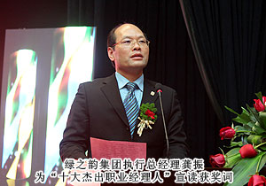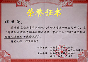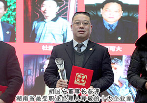 隨著商業(yè)社會的發(fā)展,職業(yè)經(jīng)理人正引領(lǐng)著未來的職業(yè)力量。在湖南,職業(yè)經(jīng)理人的迅速成長,已塑造出湖南全新的商業(yè)力量。2013年1月5日,2012湖南省職業(yè)經(jīng)理人大會暨湖南首屆優(yōu)秀職業(yè)經(jīng)理人評選頒獎典禮在長沙舉行,綠之韻集團(tuán)董事長胡國安獲評2012年度湖南省最受職業(yè)經(jīng)理人尊敬的十大企業(yè)家,綠之韻集團(tuán)執(zhí)行總經(jīng)理龔振作為湖南省職業(yè)經(jīng)理人協(xié)會首任會長出席會議。