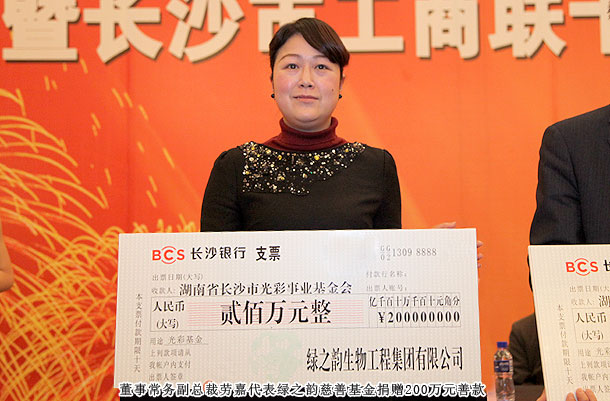 活動現(xiàn)場,長沙市光彩事業(yè)基金會第一屆理事會理事長胡國安向廣大非公經(jīng)濟人士發(fā)出倡議,并帶頭捐款200萬元,由綠之韻集團董事常務副總裁勞嘉代表綠之韻慈善基金現(xiàn)場舉牌。同時,全市工商聯(lián)各基層組織、行業(yè)(異地)商會、各會員企業(yè)代表也紛紛奉獻愛心,現(xiàn)場共募捐善款2964萬元。所募基金將用于貧困地區(qū)的扶貧開發(fā)、教育、衛(wèi)生、救災等公益事業(yè)。在胡國安理事長的積極倡議下,長沙9區(qū)縣(市)工商聯(lián)、10個行業(yè)(異地)商會、12家民營企業(yè)也將成立光彩專項基金。