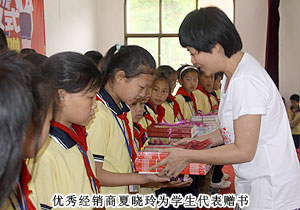 綠之韻集團(tuán)董事常務(wù)副總裁勞嘉、黨支部書記許達(dá)仲、慈善基金負(fù)責(zé)人蔣文,湖南地區(qū)優(yōu)秀經(jīng)銷商代表周書明、羅新春、夏曉玲等出席捐贈儀式,用精美的圖書為孩子們打開知識世界的一扇窗。