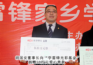 2012年2月29日,在“3?5”學(xué)習(xí)雷鋒紀(jì)念日即將到來之際,由湖南省工商聯(lián)、長沙市工商聯(lián)共同發(fā)起的“雷鋒家鄉(xiāng)學(xué)雷鋒、民營企業(yè)當(dāng)先鋒”——省會工商界人士學(xué)雷鋒慶三八大會在長沙楓林賓館拉開帷幕,吹響了湖南省會工商界爭當(dāng)學(xué)雷鋒先鋒的集結(jié)號。中共長沙市委副書記、市長張劍飛,中共長沙市委常委、市委統(tǒng)戰(zhàn)部部長文樹勛出席會議。會上,湖南省工商聯(lián)(總商會)常委、長沙市工商聯(lián)(總商會)副會長、優(yōu)秀民營企業(yè)家、綠之韻集團董事長胡國安代表綠之韻慈善基金以實際行動為湖南省光彩事業(yè)增光添彩,向“學(xué)雷鋒光彩基金”捐贈50萬元愛心善款。