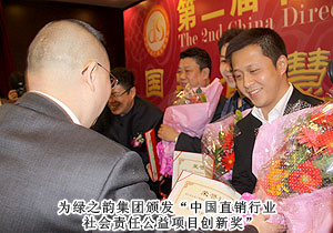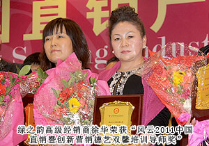 本次論壇對2011年中國直銷行業(yè)進行了總結(jié)表彰,綠之韻集團榮獲“中國直銷行業(yè)社會責任公益項目創(chuàng)新獎”“風云2011中國直銷暨創(chuàng)新營銷行業(yè)規(guī)范運作獎”;綠之韻韻宜生系列產(chǎn)品被評為“風云2011中國直銷暨創(chuàng)新營銷行業(yè)最受消費者歡迎產(chǎn)品”;綠之韻集團董事長胡國安榮獲“中國直銷行業(yè)社會責任功勛人物”榮譽稱號;綠之韻集團董事常務副總裁勞嘉榮獲“中國直銷行業(yè)社會責任卓越人物”榮譽稱號;綠之韻集團總裁助理兼企劃教育總監(jiān)何健榮獲“風云2011中國直銷暨創(chuàng)新營銷行業(yè)杰出管理人物”榮譽稱號;綠之韻高級經(jīng)銷商徐華、曹鳳華榮獲“風云2011中國直銷暨創(chuàng)新營銷德藝雙馨培訓導師獎”;綠之韻華易聯(lián)盟、華晨系統(tǒng)榮獲“風云2011中國直銷最具影響力品牌系統(tǒng)獎”; 綠之韻低碳事業(yè)部總裁戴嶸、副總裁張晉崧分別榮獲“風云2011中國直銷暨創(chuàng)新營銷行業(yè)魅力女性獎”和“風云2011中國直銷暨創(chuàng)新營銷德藝雙馨培訓導師獎” ;綠之韻優(yōu)秀經(jīng)銷商平剛、張久朋榮獲“風云2011中國營銷最具影響力品牌領袖獎”。
