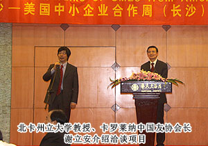 為落實(shí)周強(qiáng)書記在北京出席中美州長(zhǎng)對(duì)話會(huì)議關(guān)于“開創(chuàng)中美省州地方合作新未來”的精神,推進(jìn)湖南與北卡州簽訂的友好省州協(xié)議內(nèi)容,促進(jìn)湖南與北卡州全面開展民間經(jīng)濟(jì)外交,2011年10月20日下午,長(zhǎng)沙—美國(guó)中小企業(yè)合作周(長(zhǎng)沙)項(xiàng)目對(duì)接洽談會(huì)在華天大酒店召開,由卡羅萊納—中國(guó)友協(xié)董事會(huì)主席,北卡州議員,原美國(guó)農(nóng)業(yè)部副部長(zhǎng)Harris Blake為團(tuán)長(zhǎng)率領(lǐng)的美國(guó)北卡經(jīng)貿(mào)及友好交流訪問團(tuán)成員來長(zhǎng)與長(zhǎng)沙企業(yè)家對(duì)接洽談。長(zhǎng)沙市政協(xié)副主席、市工商聯(lián)主席彭繼球,市僑聯(lián)副主席翁少蘭等領(lǐng)導(dǎo)出席了對(duì)接洽談。繼九月訪美赴北卡州考察與美方企業(yè)有過初步對(duì)接后,此次綠之韻集團(tuán)胡國(guó)安董事長(zhǎng)再次應(yīng)邀出席合作洽談會(huì)并對(duì)北卡州龐達(dá)地產(chǎn)總裁Mark Herman想建第一座中國(guó)城的項(xiàng)目積極關(guān)注。