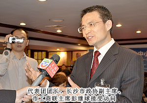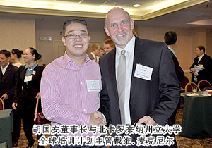 美國當(dāng)?shù)貢r間2011年9月20日上午,“長沙——美國中小企業(yè)合作周”商貿(mào)對接會在美國北卡羅來納州隆重舉行。在長沙市人民政府的組織下,來自各行各業(yè)的民營企業(yè)家在長沙市政協(xié)副主席、市工商聯(lián)主席彭繼球的帶領(lǐng)下,赴美參加為期12天的合作周考察活動。長沙市工商聯(lián)(總商會)副主席、綠之韻集團(tuán)董事長胡國安應(yīng)邀赴美考察。