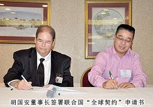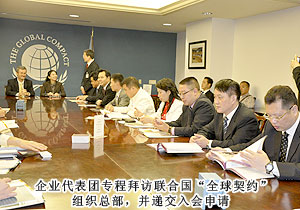 考察過程中,企業(yè)家代表團(tuán)一行專程拜訪了聯(lián)合國“全球契約”組織總部,與聯(lián)合國“全球契約”總干事喬治?科爾進(jìn)行了友好、親切的會見。綠之韻集團(tuán)、楚天科技、佳樂實業(yè)等湖南省15家民營企業(yè)現(xiàn)場向該組織遞交了入會申請。“全球契約”是一種思路和價值觀,由前聯(lián)合國秘書長安南首倡議,潘基文秘書長繼續(xù)推動。該契約旨在鼓勵全球企業(yè)與聯(lián)合國機(jī)構(gòu)、勞工組織和民間團(tuán)體一起,共同尋找克服全球化負(fù)面影響的途徑。加入該組織的單位必須在遵守人權(quán)、勞動標(biāo)準(zhǔn)、環(huán)境保護(hù)等方面率先垂范。