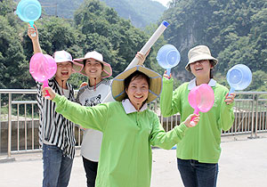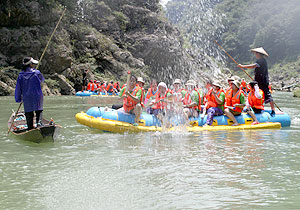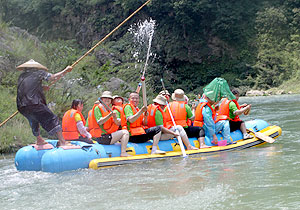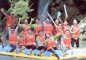 在胡國安董事長的率領(lǐng)下,伙伴們浩浩蕩蕩前往素有“天下第一漂”美譽的猛洞河漂流。大家搶購著水槍、水瓢、雨衣等打水仗的武器,懷著渴望刺激挑戰(zhàn)驚險的心情互相挑釁,只見河中水花飛舞、水柱橫飛,還未等上船伙伴們就紛紛“濕身”了。拐一百五十五個彎,在一百三十三個灘潭中穿梭而行,兩岸怪石嶙峋,野猴出沒,飛瀑激流,山與水的組合,讓許多來自北方的營銷精英大呼過癮。來自葫蘆島的65歲的韓秀芝老太,端著水槍,握著水瓢,與伙伴們暢快淋漓地酣戰(zhàn),她說:真是太過癮了,人生難得有幾回這樣的機會,我一定要帶領(lǐng)更多的伙伴來挑戰(zhàn)猛洞河!
