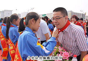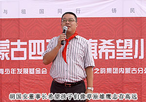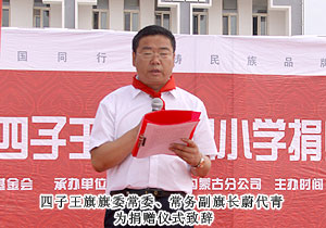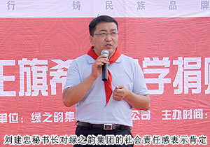 捐贈儀式現(xiàn)場,上百名綠之韻愛心精英共舞《中國人》,昂揚的氣勢,莊嚴的氛圍震撼全場。因為同是中國人,同在藍天下,所以我們更要像孟子所希望的一樣“老吾老以及人之老,幼吾幼以及人之幼”,奉獻自己力所能及的愛心,為社會輸送溫暖,讓感動在每一個人的心中升溫。少先隊員為蒞臨現(xiàn)場的領導和嘉賓敬獻紅領巾,那一抹鮮紅代表著光榮,代表著感恩,它在每一位愛心人士的胸前飄揚,讓綠之韻人的責任更加重大。四子王旗常委、常務副旗長蔚代青致歡迎辭,對綠之韻集團的大愛無疆表示誠摯的謝意和肯定。胡國安董事長發(fā)言,他表示:教育是立國之本,作為優(yōu)秀的企業(yè)公民,綠之韻始終堅持“企業(yè)做大了就是屬于國家、屬于社會的”這一社會責任理念,為捐建38所綠之韻希望小學的目標堅持不懈。草原是雄鷹的故鄉(xiāng),作為同樣從大山里走出來的孩子,胡國安董事長深深知道每一個孩子心中的夢想,希望孩子們能像鷹一樣,在學習中志存高遠,鷹擊長空。