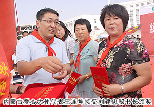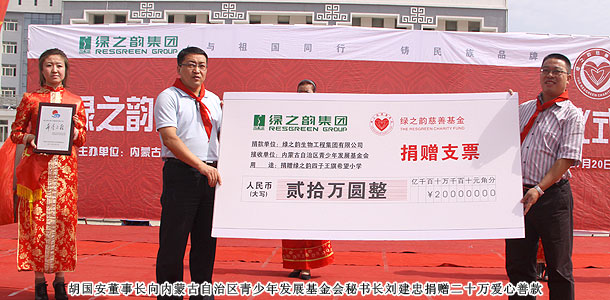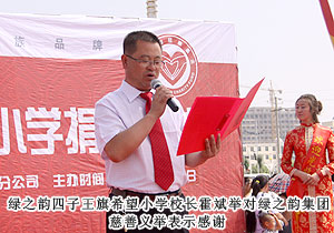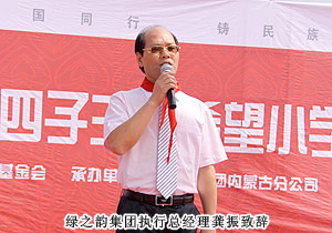 2011年7月20日,位于內蒙古自治區(qū)烏蘭察布市的四子王旗熱鬧非凡--綠之韻四子王旗希望小學在此舉行隆重的捐贈儀式。內蒙古自治區(qū)青少年發(fā)展基金會秘書長劉建忠、四子王旗旗委、常務副旗長蔚代青、政協(xié)副主席于有升、四子王旗工商局局長董明、副局長賈晉峰等政府領導及各界媒體嘉賓蒞臨,綠之韻集團董事長胡國安、執(zhí)行總經理龔振、綠之韻慈善基金總執(zhí)行戴曉彥不遠萬里趕赴捐贈現(xiàn)場,內蒙古分公司經理候立新、內蒙古地區(qū)愛心大使代表王連坤、郝建兵、張聞英以及2000余名綠之韻愛心大使參與愛心傳遞。