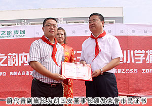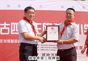 胡國安董事長向內蒙古自治區(qū)青基會秘書長劉建忠遞交二十萬捐贈支票,并接受希望工程牌匾。劉建忠秘書長發(fā)表講話,向勇于承擔社會責任的綠之韻集團和全體營銷精英致上誠摯敬意。四子王旗常委、常務副旗長蔚代青與胡國安董事長共同為希望小學揭牌,并向胡國安董事長頒發(fā)榮譽市民證書。青基會秘書長劉建忠和執(zhí)行總經理龔振給愛心經銷商頒發(fā)證書,整個活動現(xiàn)場人潮洶涌,彌漫著感恩與關愛,孩子們精彩的節(jié)目表演將揭牌儀式活動推向了高潮,現(xiàn)場所有精英心懷感動,愿意盡自己的能力獻出更多關愛和溫暖。龔總在致辭中說:在綠之韻八年的發(fā)展中,綠之韻慈善基金在教育、幫扶、救災、助學等方面作出的公益事業(yè)投入累計已近2000萬元,是每一位愛心綠之韻精英的點滴匯聚才有了公司萬涓成海的善舉。