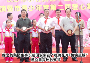 為慶?!傲弧眹H兒童節(jié)的到來,2011年5月28日,由長沙市委組織部、市委宣傳部、市文明辦、團(tuán)市委、市少工委、市教育局聯(lián)合舉辦的“杜鵑花開?情滿星城”小杜鵑藝術(shù)團(tuán)慶“六一”文藝義演暨市青少年宮第二屆愛心集市大型公益活動(dòng),在長沙市青少年宮舉行。各級(jí)政府領(lǐng)導(dǎo)以及社會(huì)各界的1000多名愛心人士與全市各區(qū)縣(市)近200名殘疾兒童、孤兒、困難家庭子女、農(nóng)村留守兒童、農(nóng)民工子女共同慶祝屬于孩子們的歡樂節(jié)日。綠之韻集團(tuán)董事長胡國安作為長沙市優(yōu)秀青年企業(yè)家代表受邀出席活動(dòng),并榮獲“杜鵑花開?情滿星城”愛心集市標(biāo)兵榮譽(yù)獎(jiǎng)牌。