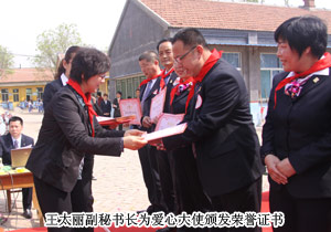 山東省青少年基金會副秘書長王太麗接受捐贈,并對綠之韻集團對社會的人文關懷表示肯定?;菝窨h人大常委會副主任張秀奎與綠之韻集團胡國安董事長共同為希望小學揭牌,并向胡國安董事長頒發(fā)了惠民縣榮譽市民證書。