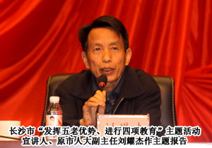 2011年4月22日,為進一步改進和加強思想政治工作,促進和實現社會和諧穩(wěn)定,由長沙市委組織部、市委宣傳部、團市委聯(lián)合主辦的“傳承光榮傳統(tǒng)?爭當時代先鋒”全市各界青年學習“五老”精神專題報告會在長沙人民會堂舉行。邀請老干部、老模范、老教師、老戰(zhàn)士和老專家進企業(yè)、進學校、進社區(qū)、進機關,進行形勢政策、黨的歷史、思想道德和公民意識教育。據悉,該活動也是團市委紀念五四運動92周年系列活動之一。