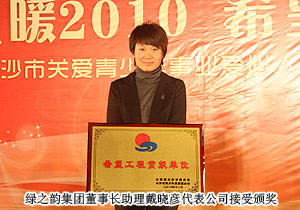 2010年12月30日,由共青團(tuán)長(zhǎng)沙市委、長(zhǎng)沙市青少年發(fā)展基金會(huì)、市青年聯(lián)合會(huì)、市青年企業(yè)家協(xié)會(huì)等聯(lián)合主辦的“溫暖2010、希望2011”長(zhǎng)沙市關(guān)愛青少年事業(yè)愛心人士嘉年華晚會(huì)在愛與感恩中舉行。湖南省軍區(qū)原副政委、省關(guān)工委副主任黃祖示,團(tuán)省委副書記馮海燕,市委常委、副市長(zhǎng)張迎龍、共青團(tuán)長(zhǎng)沙市委書記候文等出席晚會(huì)。綠之韻集團(tuán)作為湖南愛心企業(yè)代表受邀出席此次會(huì)議并榮獲“希望工程貢獻(xiàn)單位”。