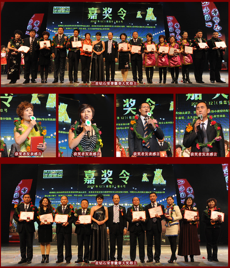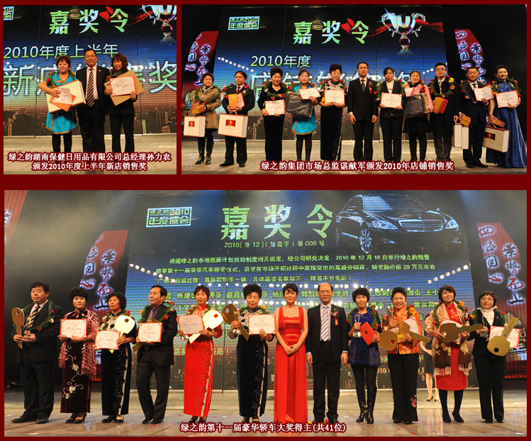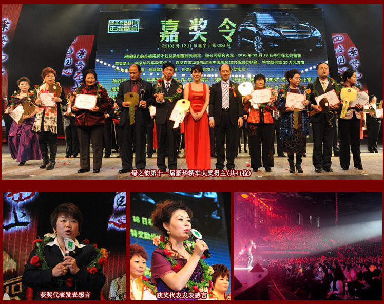 在星光閃耀、榮光無限的年會頒獎舞臺,曾經(jīng)含淚播種的英雄,此刻含笑收獲。2010年度星級鉆石榮譽(yù)徽章大獎、2010年度豪華轎車大獎、2010年店鋪銷售獎、2010年度上半年新店銷售獎,每一項榮譽(yù)都是曾經(jīng)努力奮斗的佐證。他們,在開拓中崛起,在堅持中壯大,奔跑的腳步從未停歇,在他們的感言分享中,我們可以見證綠之韻人逐夢的力量,感受夢想實(shí)現(xiàn)的喜悅與感動。