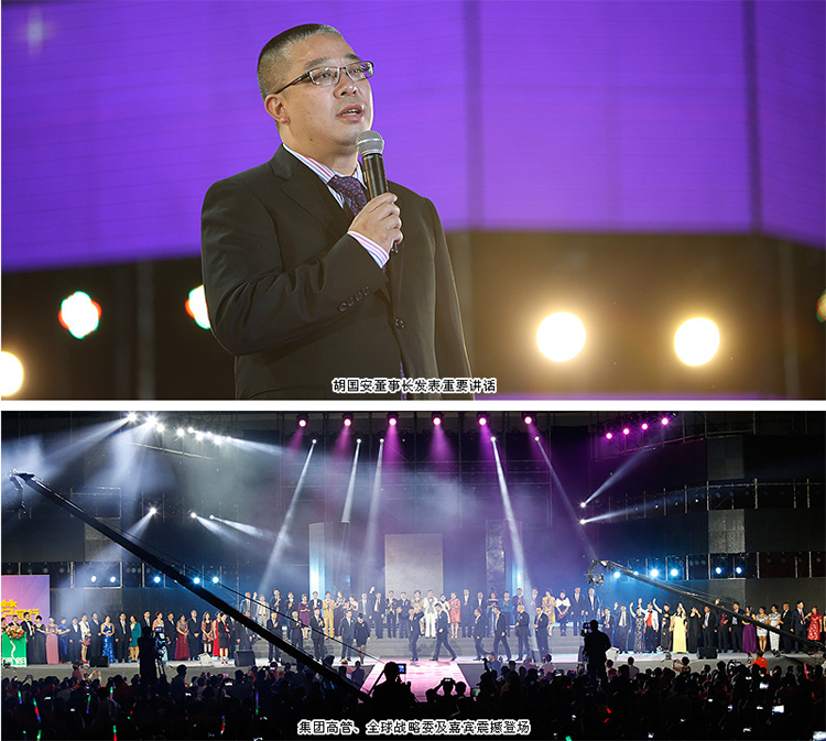 在全場(chǎng)熱烈的掌聲和歡呼聲中,胡國(guó)安董事長(zhǎng)在耀眼光束聚焦下,乘坐“綠之韻號(hào)”專(zhuān)機(jī)降落到舞臺(tái)中心,發(fā)表了熱情洋溢的重要講話?!?014年這個(gè)星光燦爛的夜晚,你們開(kāi)心嗎?首先請(qǐng)?jiān)试S我代表綠之韻集團(tuán)向長(zhǎng)期關(guān)心和支持綠之韻事業(yè)發(fā)展的各位領(lǐng)導(dǎo)嘉賓、媒體朋友和家人們致以真誠(chéng)的感謝和誠(chéng)摯的問(wèn)候。2014年習(xí)近平總書(shū)記勵(lì)精圖治,開(kāi)啟了中國(guó)夢(mèng)的嶄新篇章;一個(gè)月前,阿里美國(guó)上市,誕生了300位以上的億萬(wàn)富翁,上萬(wàn)計(jì)的千萬(wàn)富翁,開(kāi)啟了電商的嶄新篇章。2014年在所有綠之韻家人的努力下,綠之韻夢(mèng)想啟迪未來(lái)的全國(guó)巡回演講如火如荼;一個(gè)月前,綠之韻上海全球連鎖酒店成功奠基,未來(lái)全國(guó)30家全球連鎖酒店將成為廣大營(yíng)銷(xiāo)伙伴的培訓(xùn)中心。還有茶文化高端會(huì)所,連鎖餐飲……綠之韻所做的這一切,就是為了給廣大營(yíng)銷(xiāo)伙伴打造最優(yōu)秀的創(chuàng)業(yè)平臺(tái),幫助每一個(gè)綠之韻人實(shí)現(xiàn)不同階段的夢(mèng)想。今天來(lái)到現(xiàn)場(chǎng)的朋友都懷著和我一樣的夢(mèng)想。我來(lái)自雪峰山下,我兒時(shí)的夢(mèng)想是走出山村,讓父母過(guò)上幸福的生活;上大學(xué)后,我讓父母過(guò)上了幸福的生活,并萌發(fā)了創(chuàng)業(yè)的夢(mèng)想。2003年,我創(chuàng)辦了綠之韻,致力于將它發(fā)展合法的、知名的民族企業(yè)。在領(lǐng)導(dǎo)們的支持和伙伴們的努力下,綠之韻成為了全國(guó)第26家拿牌直銷(xiāo)企業(yè),成為了民族企業(yè)的驕傲。我現(xiàn)在的夢(mèng)想是在未來(lái)10年,我的有生之年,一是讓每一個(gè)綠之韻人都能成為家人的驕傲和家族的榜樣,二是讓每一個(gè)和綠之韻合作的伙伴、廠商能夠成為其所在產(chǎn)業(yè)領(lǐng)域的領(lǐng)頭羊,三是能夠帶領(lǐng)綠之韻沖出亞洲,走向世界。只要相信和堅(jiān)持,所有的夢(mèng)想一定能實(shí)現(xiàn)。祝所有的綠之韻人都能夢(mèng)想成真!”