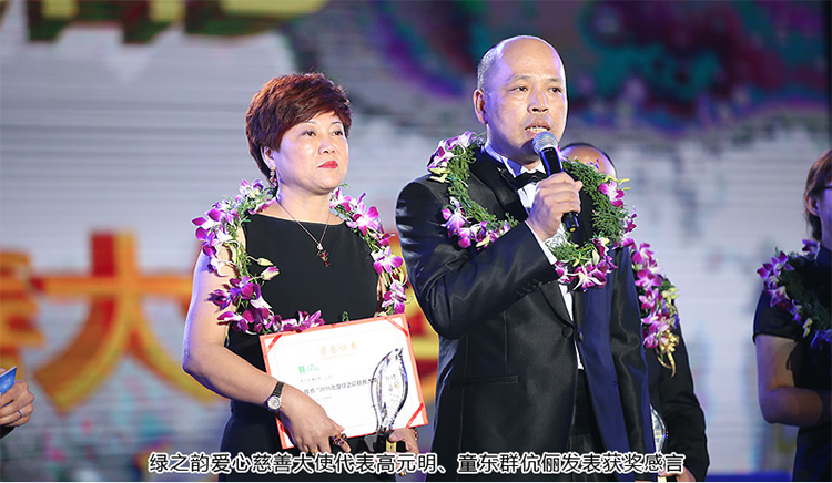 天佑善人,天自我立,真善美,無(wú)疆大愛(ài)。伴隨著綠之韻公益基金會(huì)“碼上做公益”微公益活動(dòng)現(xiàn)場(chǎng)手機(jī)捐贈(zèng)善款突破100萬(wàn)元和“超女”趙婧貽傾情演繹的公益基金會(huì)主題曲《為了你的微笑》震撼首發(fā)后,綠之韻2015年度愛(ài)心慈善大使獎(jiǎng)項(xiàng)也正式揭曉。獲此殊榮的綠之韻精英們面對(duì)微笑,款款而行,讓現(xiàn)場(chǎng)家人們真切地感受到了愛(ài)與慈善的炙熱溫度。長(zhǎng)沙市青少年發(fā)展基金會(huì)理事長(zhǎng)羊舒麟,綠之韻集團(tuán)董事、常務(wù)副總裁勞嘉頒授獎(jiǎng)項(xiàng),并致以祝賀。愛(ài)心慈善大使代表高元明、童東群伉儷發(fā)表了獲獎(jiǎng)感言。
