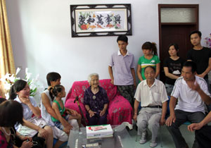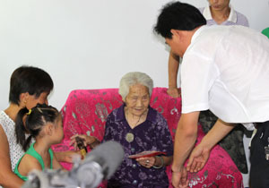 經(jīng)葉縣D8358店李增偉經(jīng)理多次奔走聯(lián)系,2010年8月13日,綠之韻尋找百位百歲老人活動小組聯(lián)合葉縣縣委宣傳部、葉縣電視臺一起對葉縣遵化店鎮(zhèn)代莊村95歲的張梅老人進(jìn)行了慰問,在送上公司誠摯祝福的同時,也將慰問金和公司健康產(chǎn)品銀杏螺旋藻禮盒裝送到老人手里。