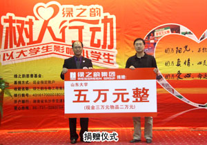 一年之計,莫如樹谷;十年之計,莫如樹木;終身之計,莫如樹人。2010年5月13日,“綠之韻樹人行動”全國第四站走進山東大學,現(xiàn)場舉行捐贈儀式,資助10名品學兼優(yōu)的貧困學生。綠之韻集團執(zhí)行總經理龔振出席會議,代表綠之韻慈善基金向貧困學子首批捐助50000元愛心善款,山東大學黨委學生工作部部長曲明軍、副部長陳鑫代表校方接受捐贈。教育界、新聞界、文化界的相關領導與兩百余名大學生見證了綠之韻人又一次善舉。