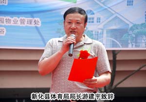 此次活動(dòng)得到了新化縣體育局的大力支持,局長游建宇出席會(huì)議并作重要講話,同時(shí)蒞臨現(xiàn)場的領(lǐng)導(dǎo)嘉賓還有中共新化縣委常委,宣傳部長游世友、新化縣人大常委會(huì)副主任曾新華、新化縣公平交易局局長鄧文斌、新化電視臺(tái)新聞部副部長游進(jìn)、教育電視臺(tái)副臺(tái)長劉雄等。湖南地區(qū)重要系統(tǒng)領(lǐng)導(dǎo)人衛(wèi)同俊、黃翔、周書明、李正元、張新出席會(huì)議。