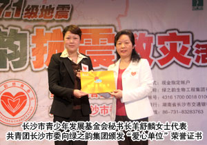執(zhí)行總經(jīng)理龔振致捐款倡議書,向下屬公司、全國各地分公司、全國加盟專賣店及分銷員發(fā)出募捐倡議,號召全體綠之韻人向災(zāi)區(qū)人民伸出援助之手,為災(zāi)區(qū)送上一份愛心,點燃一份希望。會上,羊舒麟秘書長代表共青團長沙市委向綠之韻集團頒發(fā)“愛心單位”榮譽證書,勞嘉副總接受榮譽證書并表示:奉獻愛心,扶危濟困,綠之韻長久以來的經(jīng)營理念永遠離不開“回饋”二字,在綠之韻人的共同努力下,相信我們用愛心匯聚的暖陽,一定能驅(qū)散災(zāi)難的陰霾!