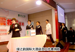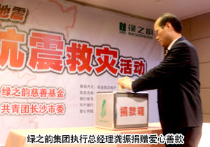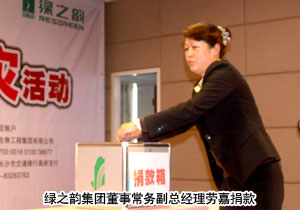 2010年4月18日,綠之韻集團“情系玉樹?共筑家園”抗震救災(zāi)捐款活動在綠之韻國際大酒店貴賓樓舉辦,聯(lián)合長沙市青少年發(fā)展基金會向災(zāi)區(qū)捐贈了第一筆愛心善款——30萬元現(xiàn)金及物資。共青團長沙市委副書記彭勇、長沙市青少年發(fā)展基金會秘書長羊舒麟代表災(zāi)區(qū)現(xiàn)場接受捐贈。長沙市新聞頻道、長沙晚報等新聞媒體出席會議并現(xiàn)場報道捐款情況。綠之韻集團董事常務(wù)副總經(jīng)理勞嘉、執(zhí)行總經(jīng)理龔振、市場總監(jiān)諶獻軍等集團高管與集團總部、國際大酒店、迪博制藥廠的員工代表、第二十九屆區(qū)域(高級)經(jīng)理以及湖南地區(qū)分銷商代表現(xiàn)場踴躍捐款。胡國安董事長雖身在異地,但仍通過總裁辦捐助愛心善款,并表達了對災(zāi)區(qū)同胞的關(guān)懷和鼓勵。