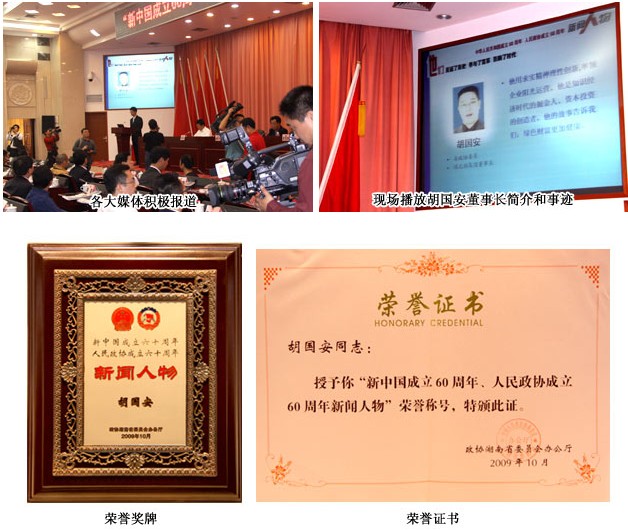 湖南省政協(xié)委員、綠之韻集團(tuán)董事長(zhǎng)胡國(guó)安被評(píng)選為“新中國(guó)成立60周年人民政協(xié)成立60周年新聞人物”,充分肯定了綠之韻集團(tuán)和胡國(guó)安董事長(zhǎng)在發(fā)展事業(yè)的同時(shí),為社會(huì)進(jìn)步所做的貢獻(xiàn),為經(jīng)濟(jì)發(fā)展所做出的重要成績(jī)。胡國(guó)安董事長(zhǎng)因在國(guó)外學(xué)習(xí)而未能趕到現(xiàn)場(chǎng),綠之韻集團(tuán)董事長(zhǎng)助理馬艷代表胡國(guó)安董事長(zhǎng)出席現(xiàn)場(chǎng)領(lǐng)獎(jiǎng)。胡國(guó)安董事長(zhǎng)表示,綠之韻集團(tuán)將以更成熟穩(wěn)健的步伐邁向更寬廣的發(fā)展之路,以更強(qiáng)的責(zé)任感去擔(dān)當(dāng)社會(huì)發(fā)展中的使命。同時(shí)獲此殊榮的還有 “雜交水稻之父”袁隆平;中國(guó)工程院院士、湖南大學(xué)校長(zhǎng)鐘志華等。