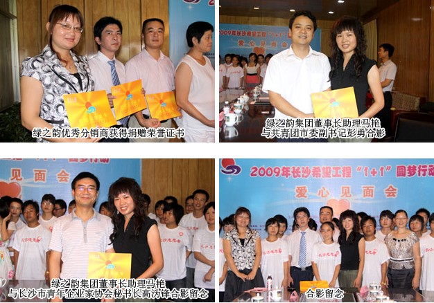 8月28日,湖南省長沙市青少年宮內洋溢著濃濃的愛心——在綠之韻慈善基金及綠之韻湖南分公司的組織下,以大學生影響小學生“綠之韻樹人行動”全國第三站暨共青團長沙市委“2009長沙希望工程圓夢行動”愛心見面會在此舉行。共青團長沙市委副書記彭勇、長沙市青年企業(yè)家協(xié)會秘書長高溈鋒、長沙市青年聯(lián)合會副秘書長楊溶、長沙市青少年發(fā)展基金會副秘書長羊舒麟等領導,以及綠之韻集團董事長助理、慈善基金秘書長馬艷、綠之韻愛心分銷商張建軍、黃翔、周書明、沈慧芳、李正元出席會議并捐贈愛心款項。此次行動以“一幫幾”的結對幫扶形式向近200名貧困準大學生發(fā)放55萬元助學款,用愛心托起了他們的大學夢。綠之韻集團利用樹人行動的愛心力量共幫扶了七名考上清華、北大等名校卻無力承擔學費的寒門學子。