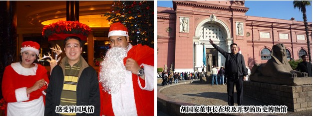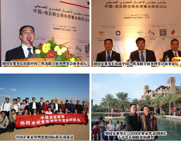中國(guó)企業(yè)家管理思想國(guó)際俱樂部代表團(tuán),在團(tuán)長(zhǎng)于彥忠秘書長(zhǎng)的率領(lǐng)下,經(jīng)過六天,行程2萬余公里,圓滿結(jié)束了對(duì)埃及和阿聯(lián)酋的訪問,于2008年12月28日晚11點(diǎn)回到北京。開羅是埃及的首都,近年來經(jīng)濟(jì)發(fā)展迅速,蘊(yùn)藏著無限商機(jī)。在此次的中埃聯(lián)合商務(wù)理事論壇上,胡國(guó)安與埃方洽談綠之韻在埃及的合作項(xiàng)目。
