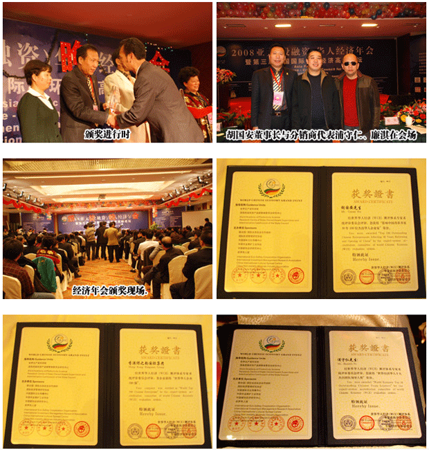 綠之韻集團(tuán)胡國安董事長受邀全程出席此次會議,綠之韻集團(tuán)榮獲“世界華人企業(yè)500強(qiáng)”榮譽(yù)大獎,胡國安董事長個人被評為“影響中國改革開放30年100位杰出華人企業(yè)家”, 全國工商聯(lián)副主席孫曉華為胡國安董事長頒獎; 綠之韻分銷商管理委員會會長浦守仁獲“2008年世界經(jīng)濟(jì)華人十大杰出團(tuán)隊領(lǐng)導(dǎo)人獎”。