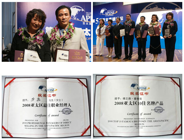 在此次論壇上,綠之韻集團(tuán)銀杏螺旋藻、玉感紫錐菊被評(píng)為“2008亞太區(qū)10佳名牌產(chǎn)品”。綠之韻集團(tuán)董事、常務(wù)副總經(jīng)理勞嘉獲“2008亞太區(qū)最佳職業(yè)經(jīng)理人”稱(chēng)號(hào)。綠之韻集團(tuán)優(yōu)秀分銷(xiāo)商代表徐華榮獲“ 2008亞太區(qū)十佳善行典范經(jīng)銷(xiāo)商”、張吉福榮獲“2008亞太區(qū)十佳金牌培訓(xùn)師”、劉國(guó)立榮獲“ 2008 亞太區(qū)50位杰出經(jīng)銷(xiāo)商”、黃淑青榮獲“2008 亞太區(qū)50位杰出經(jīng)銷(xiāo)商 ”、史朋榮獲“ 2008 亞太區(qū)善行典范經(jīng)銷(xiāo)商”榮譽(yù)稱(chēng)號(hào)。
