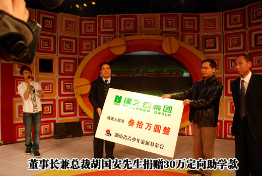 該節(jié)目聯(lián)合愛心企業(yè)籌集善款為貧困山區(qū)捐贈希望小學的欄目宗旨正與綠之韻集團公司愛心助學的理念不謀而合,引起了集團公司領導的關注,并最終促成了此次的合作,這也是該欄目首次推出湖南省外的希望小學捐贈活動。綠之韻集團董事長兼總裁胡國安親臨節(jié)目現(xiàn)場將30萬元現(xiàn)金支票捐贈到湖南省青少年發(fā)展基金會副秘書長李秋林以及孟憲臣校長手中。胡總說:“捐贈38所綠之韻希望學校是所有綠之韻人的追求,三年以來,集團公司投入在慈善公益方面的款項累計已達500多萬,在以后的日子里,我們?nèi)詫⒉粩嗟臑楦黜椛鐣婊顒臃瞰I愛心,幫助更多需要幫助的人,在勇往直前的事業(yè)發(fā)展途中,讓愛見證每一位綠之韻人的情懷。