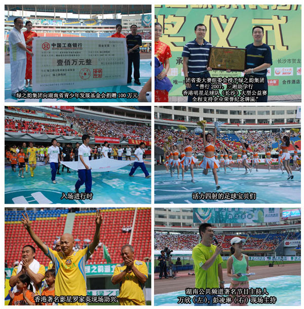 2007年5月20日下午3點(diǎn),星城長(zhǎng)沙因?yàn)檫h(yuǎn)道而來(lái)的香港明星足球隊(duì)和來(lái)自全國(guó)各地的綠之韻精英顯得更加光輝燦爛。為歡慶四周年慶典,綠之韻集團(tuán)公司與香港明星足球隊(duì)攜手的“綠之韻杯善行2007三湘助學(xué)行”香港明星足球隊(duì)(長(zhǎng)沙)大型公益賽”在賀龍?bào)w育中心隆重進(jìn)行。這是一場(chǎng)由共青團(tuán)湖南省委、湖南省體育局指導(dǎo),湖南省青少年發(fā)展基金會(huì)主辦、綠之韻集團(tuán)全程支持的以助學(xué)為宗旨,以推動(dòng)我省農(nóng)村青年文化扶貧計(jì)劃為主旋律的大型公益活動(dòng)。湖南省人大常委會(huì)副主任王四連女士、共青團(tuán)湖南省委副書記張值恒先生為本次賽事致辭,共青團(tuán)湖南省委副書記陳雪楚、湖南省文化廳廳長(zhǎng)金則恭、湖南省體育局副局長(zhǎng)熊倪、湖南省青少年發(fā)展基金會(huì)理事長(zhǎng)李克勛、中共長(zhǎng)沙市委常委、市政府常務(wù)副市長(zhǎng)向力力、長(zhǎng)沙市人大副主任張菊平 、長(zhǎng)沙市政府副市長(zhǎng)曹亞等政府領(lǐng)導(dǎo)也親臨球賽現(xiàn)場(chǎng)。慈善與體育的水乳交融,明星與精英的交相輝映,讓整個(gè)賽場(chǎng)呈現(xiàn)出令人振奮的萬(wàn)千姿彩。綠茵場(chǎng)上,這場(chǎng)在善行的大旗下,以愛(ài)心的名義舉行的公益足球賽,由湖南省青少年發(fā)展基金會(huì)理事長(zhǎng)李克勛先生和綠之韻集團(tuán)董事長(zhǎng)胡國(guó)安先生共同為比賽開(kāi)球。香港明星足球隊(duì)與綠之韻善行聯(lián)隊(duì)的對(duì)抗精彩紛呈。譚詠麟、陳百?gòu)?qiáng)、黃日華、羅家英等明星在球場(chǎng)上同樣風(fēng)采照人?;盍λ纳涞淖闱?qū)氊愋?、賽事中?chǎng)香港著名歌星左筠、影星羅家英和炙手可熱的超女唐笑等相繼一展美妙歌喉的精彩表演讓現(xiàn)場(chǎng)觀眾熱情高漲