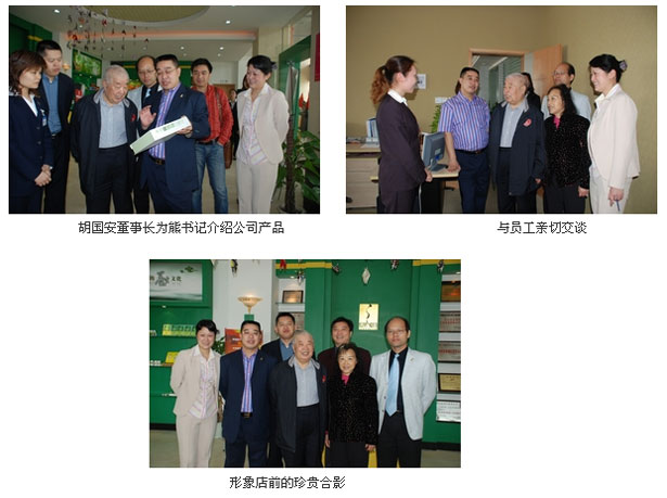 2007年4月15日,原湖南省委書記熊清泉攜其夫人蒞臨綠之韻集團(tuán)考察指導(dǎo)工作?!吧菩?007、三湘助學(xué)行”香港明星足球隊(長沙)大型公益義演賽組委會總顧問、綠之韻集團(tuán)董事長兼總裁胡國安先生,綠之韻集團(tuán)董事、執(zhí)行總經(jīng)理陳社行先生,董事、常務(wù)副總經(jīng)理勞嘉女士,綠之韻國際集團(tuán)(東南亞)股份有限公司執(zhí)行總經(jīng)理龔振先生對老書記的到來表示了最熱烈的歡迎。并親自陪同老領(lǐng)導(dǎo)進(jìn)行了詳細(xì)實察。