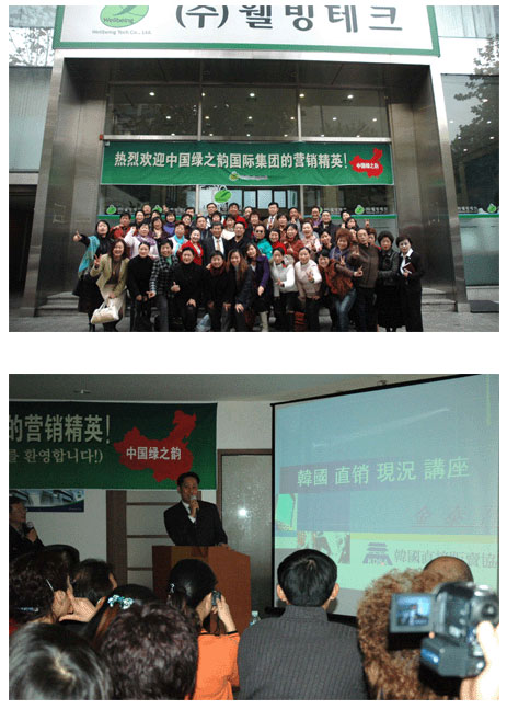 隨后,綠之韻考察團(tuán)和“Wellbeingtech”公司的高級(jí)經(jīng)銷商代表們友好會(huì)面,幾百人的會(huì)場(chǎng)座無(wú)虛席。綠之韻集團(tuán)董事長(zhǎng)胡國(guó)安先生一番慷慨激昂的即興演講博得了韓國(guó)直銷人士持久熱烈的掌聲。而韓國(guó)公司的張?jiān)緯?huì)長(zhǎng)也向綠之韻精英們介紹了該公司的發(fā)展歷程,韓國(guó)良好的市場(chǎng)前景也讓躊躇滿志的綠之韻精英信心百倍。之后,企業(yè)雙方的高級(jí)經(jīng)銷商們共同聆聽(tīng)了韓國(guó)直銷協(xié)會(huì)次長(zhǎng)金泰吾的精彩演講。讓在座的精英更加直觀和深入地了解韓國(guó)直銷市場(chǎng)的發(fā)展和直銷事業(yè)的運(yùn)作。