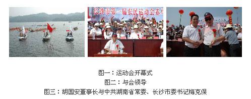 仲秋喜盼豐收日,盛世歡慶國慶時。2006年9月22日上午,由長沙市市委、長沙市人民政府主辦,綠之韻公司出資協(xié)辦的“長沙市第一屆農(nóng)民運動會龍舟賽”在風(fēng)光秀美的瀏陽赤馬湖隆重開幕。湖南省常委、長沙市委書記梅克保、長沙市委巡視員、市人大黨組第一副書記余合泉、長沙市市委副書記吳志雄、長沙市市委秘書長張湘濤、長沙市人大副主任劉耀杰、長沙市人民政府副市長曹亞、長沙市政協(xié)副主席柳冠群、市政協(xié)副主席姚五零、瀏陽市委書記易佳良、綠之韻集團董事長兼總裁胡國安先生與省市領(lǐng)導(dǎo)共同出席了第一屆農(nóng)民運動會開幕式。