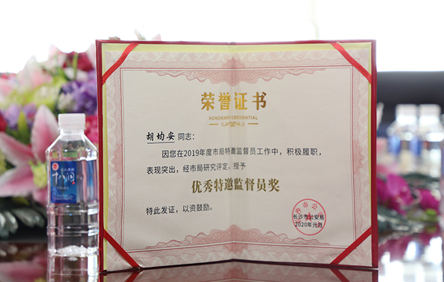 調(diào)研期間,長(zhǎng)沙市公安局機(jī)關(guān)紀(jì)委副書(shū)記、知偵支隊(duì)黨委委員、副支隊(duì)長(zhǎng)謝勝向特邀監(jiān)督員簡(jiǎn)要匯報(bào)了2020年第一季度長(zhǎng)沙市公安局主要工作:2020年是長(zhǎng)沙公安的“社會(huì)治理創(chuàng)新年”“數(shù)據(jù)警務(wù)深化年”和“保障體系優(yōu)化年”,一季度市局工作主要圍繞“戰(zhàn)役情,保平安,體現(xiàn)長(zhǎng)沙公安擔(dān)當(dāng);提能力,強(qiáng)隊(duì)伍,全面從嚴(yán)管黨治警;嚴(yán)打處,提服務(wù),維護(hù)社會(huì)治安穩(wěn)定”三個(gè)方面開(kāi)展,取得了一定的成果。他表示,建立特邀監(jiān)督員制度是長(zhǎng)沙公安機(jī)關(guān)以開(kāi)放的姿態(tài)主動(dòng)接受外部監(jiān)督的一項(xiàng)重要舉措,從這一年多時(shí)間的實(shí)踐來(lái)看,各位特邀監(jiān)督員能夠主動(dòng)履職盡責(zé),積極建言獻(xiàn)策,充分發(fā)揮了群眾基礎(chǔ)好、業(yè)務(wù)水平高、實(shí)踐經(jīng)驗(yàn)豐富等優(yōu)勢(shì),從第三者的視角彌補(bǔ)了紀(jì)檢機(jī)關(guān)的監(jiān)督盲區(qū),為長(zhǎng)沙公安隊(duì)伍建設(shè)提出了許多寶貴的意見(jiàn)建議。座談會(huì)上,市局機(jī)關(guān)紀(jì)委副書(shū)記、知偵支隊(duì)黨委委員、副支隊(duì)長(zhǎng)謝勝向胡均安副總裁頒發(fā)了“優(yōu)秀特邀監(jiān)督員”榮譽(yù)證書(shū)。