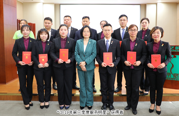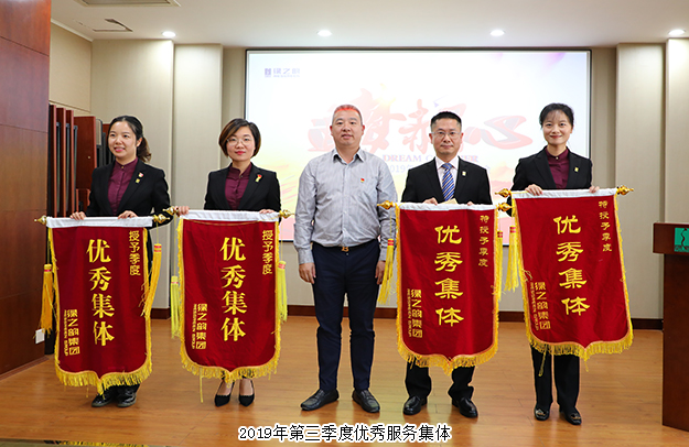 為表彰先進、凝聚力量,進一步激勵全體員工的積極性和奮斗激情,大會集中頒發(fā)了“三季度優(yōu)秀服務(wù)集體”“三季度服務(wù)明星”“五年服務(wù)英才獎”“十年服務(wù)忠誠獎”等獎項。業(yè)務(wù)服務(wù)部、新聞信息中心、市場管理中心、后勤組榮獲“2019年第三季度優(yōu)秀服務(wù)集體”稱號,譚紅、徐小峰、王雪、言芝艷、王壯、尹天弈、賀瑤、彭芳、劉靜、劉博、高素丹、胡益軍、戴明勇、彭贛躲、蘇龍英被評為“2019年第三季度服務(wù)明星”,綠之韻集團副總裁劉淑娟、胡均安為獲獎部門代表及個人頒獎。彭芳、許長征、程芳、王壯、楊建軍、郭為、王雪、李琳、勞慶強、戴明勇、黃路榮膺“五年服務(wù)英才獎”,陳敏、呂晶、黃繼民、羅嬋榮膺“十年服務(wù)忠誠獎”,綠之韻集團總經(jīng)理劉維利、董事總裁勞嘉先后上臺為獲獎員工頒發(fā)獎?wù)屡c榮譽證書,并致以熱烈祝賀。“五年服務(wù)英才獎”代表程芳和“十年服務(wù)忠誠獎”代表陳敏分別發(fā)表獲獎感言。