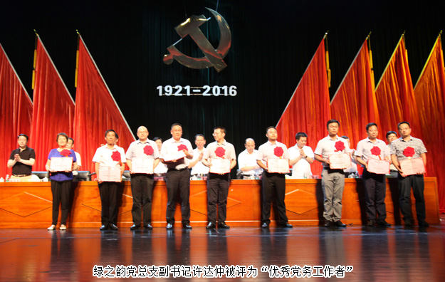 2016年7月1日,瀏陽經(jīng)開區(qū)慶祝建黨95周年表彰大會暨合唱比賽在園區(qū)金陽文化藝術(shù)中心隆重召開。全體黨委領(lǐng)導(dǎo)、機(jī)關(guān)各支部、各非公經(jīng)濟(jì)黨組織以及園區(qū)各企業(yè)代表團(tuán)等參加會議。會上,綠之韻集團(tuán)黨總支部憑借出色的黨建工作再次被評為“先進(jìn)基層黨組織”, 綠之韻黨總支副書記許達(dá)仲被評為“優(yōu)秀黨務(wù)工作者”,公司員工黃姣、楊丹被評為園區(qū)“優(yōu)秀共產(chǎn)黨員”。