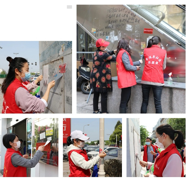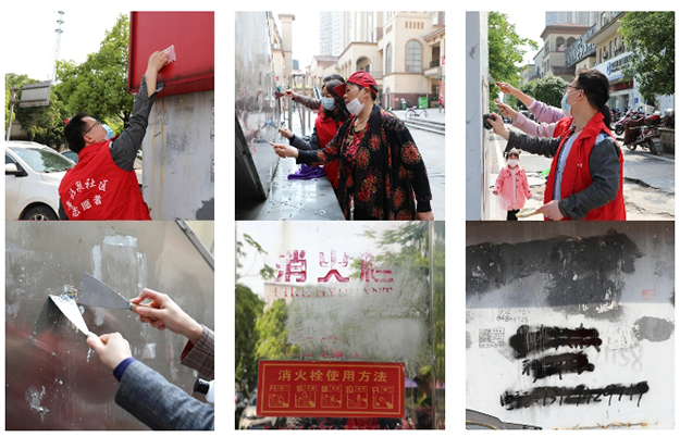 活動(dòng)現(xiàn)場,綠之韻黨團(tuán)志愿者們穿著紅色馬甲,整裝待發(fā)。他們手里拿著抹布、鏟子、鋼絲球、清潔劑等工具,涌入幸福泉社區(qū)周邊街道的各個(gè)角落,清除著馬路邊、商鋪前的各類牛皮癬。綠之韻黨團(tuán)志愿者還來到了仙人山農(nóng)貿(mào)市場,對農(nóng)貿(mào)市場的商戶們進(jìn)行環(huán)境衛(wèi)生的相關(guān)宣傳,并將自己制作的衛(wèi)生防疫知識(shí)宣傳單分發(fā)到每一個(gè)商戶手中,用實(shí)際行動(dòng)踐行著“防疫有我,愛衛(wèi)同行”的主題精神。