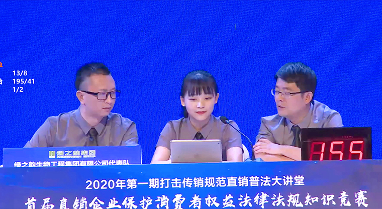 8月20日,根據(jù)國家市場監(jiān)督管理總局工作安排,由國家市場監(jiān)督管理總局規(guī)范直銷與打擊傳銷辦公室指導(dǎo)、中國消費(fèi)者報(bào)社承辦、重慶市市場監(jiān)督管理局協(xié)辦的2020年首期打傳規(guī)直普法大講堂宣傳活動(dòng)在重慶召開。綠之韻集團(tuán)受邀參加本次會(huì)議,并組建知識競賽代表隊(duì)參與“直銷企業(yè)保護(hù)消費(fèi)者權(quán)益法律法規(guī)知識競賽”環(huán)節(jié),與其他 8 家直銷企業(yè)代表隊(duì)同臺競技,展示行業(yè)整體積極風(fēng)貌。