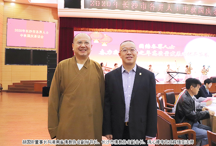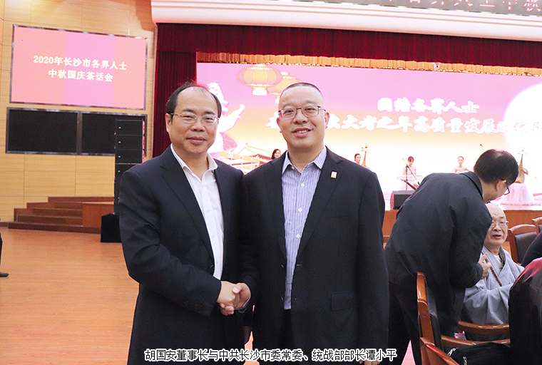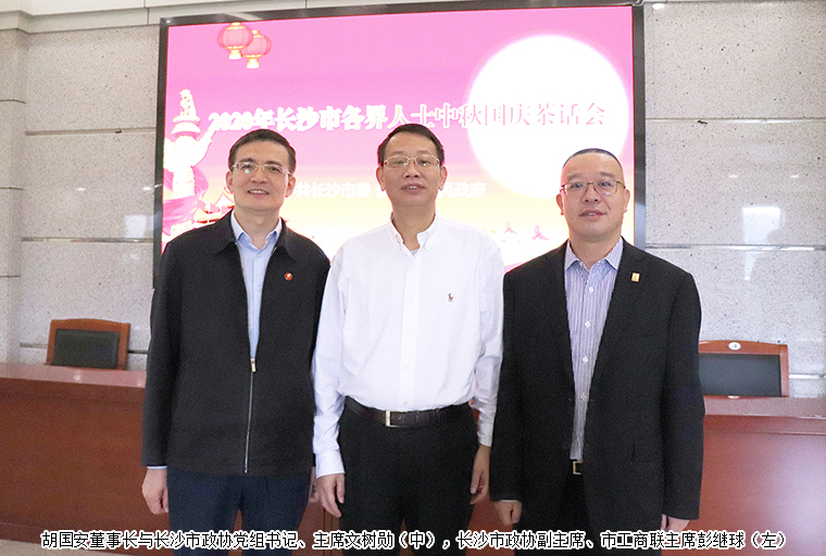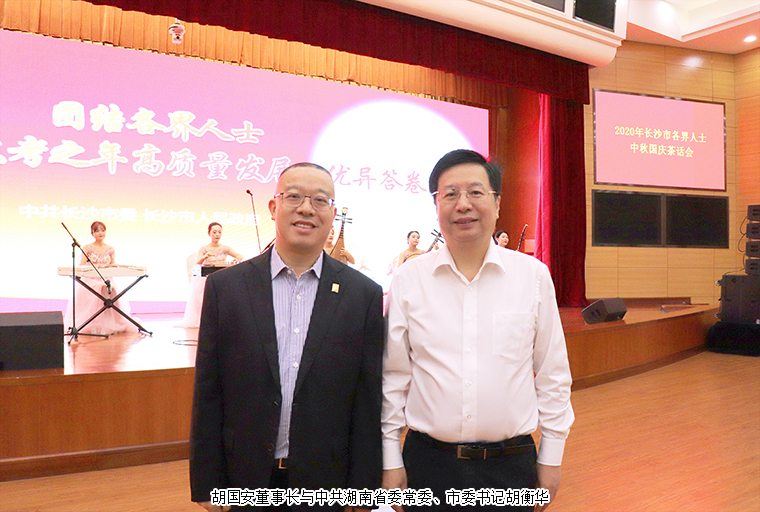 2020年9月28日,由中共長(zhǎng)沙市委、長(zhǎng)沙市政府主辦的2020年長(zhǎng)沙市各界人士中秋國(guó)慶茶話會(huì)在長(zhǎng)沙市會(huì)議中心召開(kāi)。中共湖南省委常委、長(zhǎng)沙市委書(shū)記胡衡華,長(zhǎng)沙市人大常委會(huì)黨組書(shū)記、主任謝衛(wèi)東,長(zhǎng)沙市政協(xié)黨組書(shū)記、主席文樹(shù)勛,中共長(zhǎng)沙市委常委、統(tǒng)戰(zhàn)部部長(zhǎng)譚小平以及全市離退休老同志、各界人士共同出席活動(dòng)。湖南省政協(xié)委員、香港長(zhǎng)沙聯(lián)誼會(huì)名譽(yù)會(huì)長(zhǎng)、香港長(zhǎng)沙商會(huì)常務(wù)副會(huì)長(zhǎng)、綠之韻集團(tuán)董事長(zhǎng)胡國(guó)安受邀出席活動(dòng),與參會(huì)嘉賓歡聚一堂,共敘友情、共謀發(fā)展,共慶中秋佳節(jié)和中華人民共和國(guó)成立71周年。