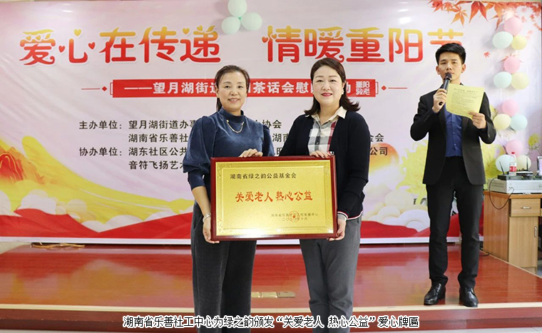 活動(dòng)期間,湖南省綠之韻公益基金會(huì)向湖南省樂(lè)善社會(huì)工作發(fā)展中心捐贈(zèng)10萬(wàn)元用于綠之韻微孝之旅公益項(xiàng)目,此項(xiàng)目專門(mén)針對(duì)高齡老人、失獨(dú)老人、計(jì)生特殊家庭和貧困家庭進(jìn)行公益幫扶。湖南省樂(lè)善社會(huì)工作發(fā)展中心理事長(zhǎng)羅樂(lè)為勞嘉理事長(zhǎng)頒發(fā)“關(guān)愛(ài)老人 熱心公益”愛(ài)心牌匾。