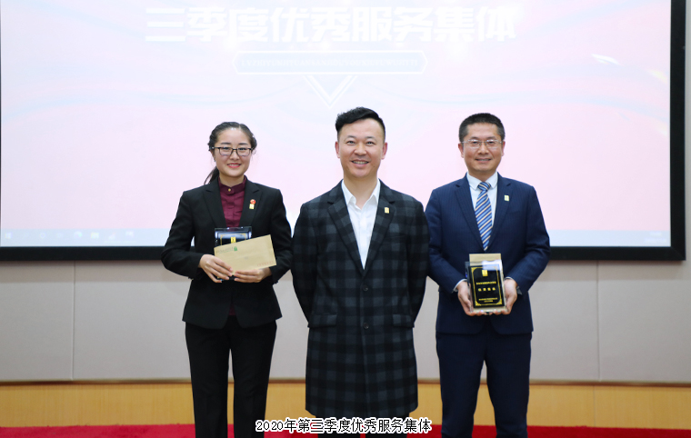 為表彰先進(jìn)、凝聚力量,進(jìn)一步激勵全體員工的積極性和奮斗激情,大會集中頒發(fā)了“三季度優(yōu)秀服務(wù)集體”“三季度服務(wù)明星”“五年服務(wù)英才獎”“十年服務(wù)忠誠獎”等獎項。傭金結(jié)算中心、新聞信息中心榮獲“2020年第三季度優(yōu)秀服務(wù)集體”稱號,喻鳴鸞、靳威、楊邢軒、李向宇、王雪、牛小紅、戴明玉、林智文、李思、夏丹、劉偉、李克戰(zhàn)、戴明勇、蘇銅、肖巧林被評為“2020年第三季度星級優(yōu)秀員工”,綠之韻集團(tuán)副總裁劉淑娟、總經(jīng)理劉維利為獲獎部門代表及個人頒獎。肖波、曾夢繁、朱麗妍、張婭、蘇妍、陳苗、張煜軒、劉博、吳冬梅、李星麗、牛小紅、孟慶玲、袁新星、張琳、鄧金林、劉伏海榮膺“五年服務(wù)英才獎”,張曉芳、周金霖、盛夏、高素丹、彭姣、高芳榮膺“十年服務(wù)忠誠獎”,綠之韻集團(tuán)董事總裁勞嘉、副總裁胡均安先后上臺為獲獎員工頒發(fā)獎?wù)屡c榮譽(yù)證書,并致以熱烈祝賀?!拔迥攴?wù)英才獎”代表肖波和“十年服務(wù)忠誠獎”代表周金霖分別發(fā)表獲獎感言。
