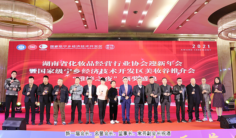 當(dāng)晚,還舉行了湖南省化妝品經(jīng)營行業(yè)協(xié)會(huì)迎新年會(huì)。湖南省化妝品經(jīng)營行業(yè)協(xié)會(huì)新一屆會(huì)長、名譽(yù)會(huì)長、監(jiān)事長、常務(wù)副會(huì)長等領(lǐng)導(dǎo)班子成員上臺祝酒。晚宴現(xiàn)場為本年度行業(yè)內(nèi)表現(xiàn)突出、取得優(yōu)異成績的會(huì)員企業(yè)頒獎(jiǎng)。綠之韻生物工程集團(tuán)有限公司獲評“20年功勛企業(yè)”榮譽(yù)稱號。