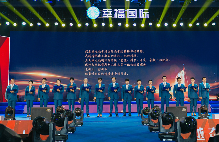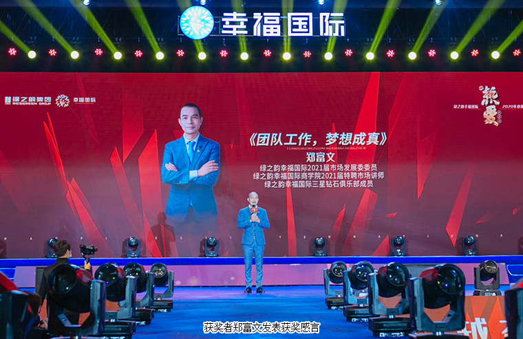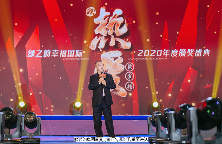 大會最后,在全場最為熱烈的掌聲中,綠之韻集團(tuán)董事長胡國安上臺講話。他首先向大會現(xiàn)場以及通過在線互動視頻觀看本次大會盛況的綠之韻家人致以熱烈的歡迎和誠摯的問候,并向每一位獲獎?wù)弑硎緹崃业淖YR。他表示,在綠之韻幸福國際,只要你們足夠努力,只要你們跟隨公司一起奮斗,每一位綠之韻家人都能夠擁有夢想成真的機(jī)會,都能收獲成功和幸福。我相信,在集團(tuán)董事、總裁勞嘉帶領(lǐng)市場服務(wù)團(tuán)隊(duì)的大力支持下,在執(zhí)行總經(jīng)理夏運(yùn)良帶領(lǐng)的市場管理團(tuán)隊(duì)的努力開拓下,幸福國際一定能夠成為綠之韻的王牌部隊(duì)。不久前,我在看到北大陳春花教授的一篇文章,文章中講道2021年的關(guān)鍵詞是信心。信心比黃金更重要。綠之韻幸福國際的信心便來自于集團(tuán)董事、總裁勞嘉帶領(lǐng)市場服務(wù)團(tuán)隊(duì)和執(zhí)行總經(jīng)理夏運(yùn)良帶領(lǐng)的市場管理團(tuán)隊(duì)。未來三年,在集團(tuán)公司的全力支持下,在現(xiàn)場每一位和通過視頻收聽的綠之韻家人的支持下,我們一定能實(shí)現(xiàn)三年百億的目標(biāo)。我真心的祝愿每一位綠之韻幸福國際的家人在市場發(fā)展的路上,能夠傳遞愛,傳遞幸福,傳播綠之韻的企業(yè)文化,最終實(shí)現(xiàn)你們不同階段的人生夢想。作為綠之韻集團(tuán)的掌門人,我對綠之韻幸福國際這支團(tuán)隊(duì)充滿著信心,我永遠(yuǎn)是你們最堅(jiān)實(shí)的后盾!