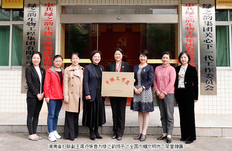 2021年3月29日,湖南省婦聯(lián)副主席盧妹香、省婦聯(lián)婦女發(fā)展部部長陳敏、省婦女兒童發(fā)展基金會辦公室主任湯鳳英、省婦聯(lián)婦女發(fā)展部三級主任科員符靚等一行蒞臨綠之韻集團(tuán),為綠之韻授予“全國巾幗文明崗”榮譽牌匾。綠之韻集團(tuán)董事、總裁勞嘉,黨委書記劉云,工會主席兼集團(tuán)辦公室行政總監(jiān)馮紅參與授牌儀式。
