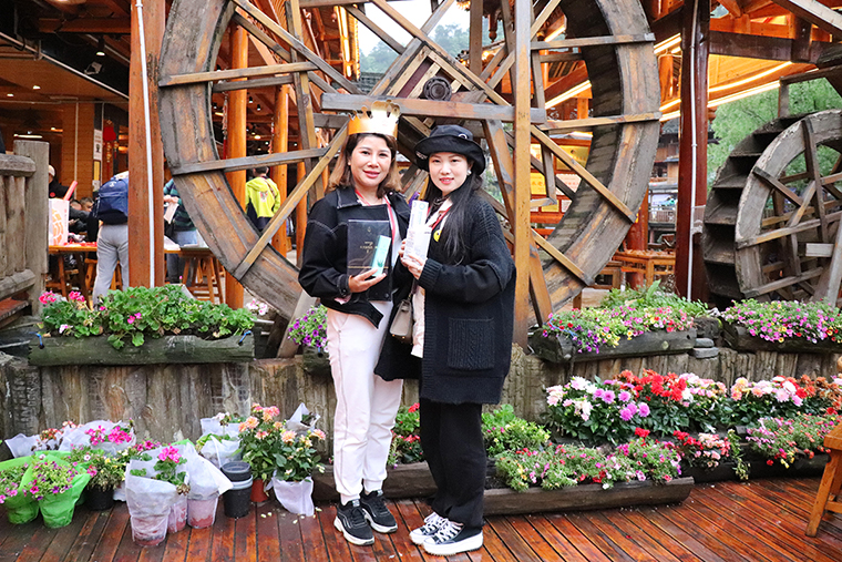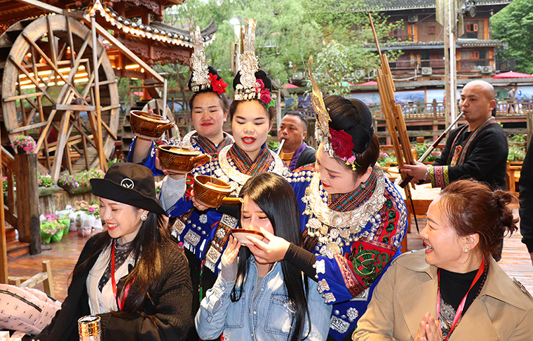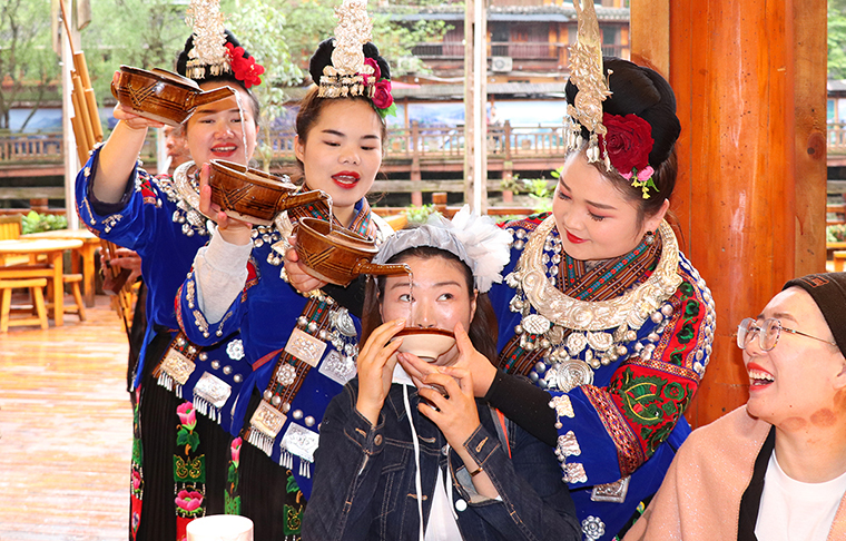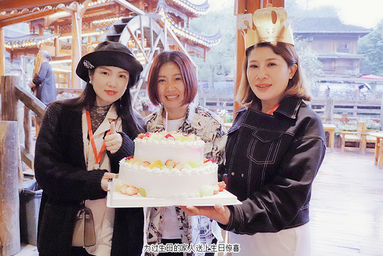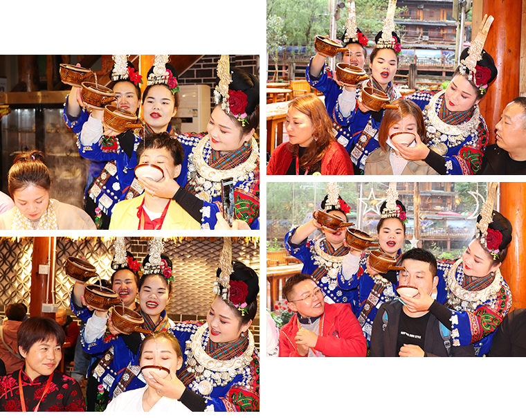 來到苗寨,熱情好客的苗族人民為綠之韻家人們準(zhǔn)備了長(zhǎng)桌宴,苗族傳統(tǒng)美食擺滿桌面,美味飄香。隨后,苗族人民為家人們帶來了“高山流水”的民俗表演。苗族阿哥們吹著笙,阿妹們則邊唱著迎賓的曲子,拿出盛著米甜酒的牛角,把酒挨個(gè)倒進(jìn)家人們的嘴里,只有飲過此酒才能進(jìn)去苗寨。當(dāng)天,適逢兩位家人生日,綠之韻集團(tuán)副總經(jīng)理梅其慧為過生日的家人準(zhǔn)備了生日蛋糕和節(jié)日的驚喜大禮。